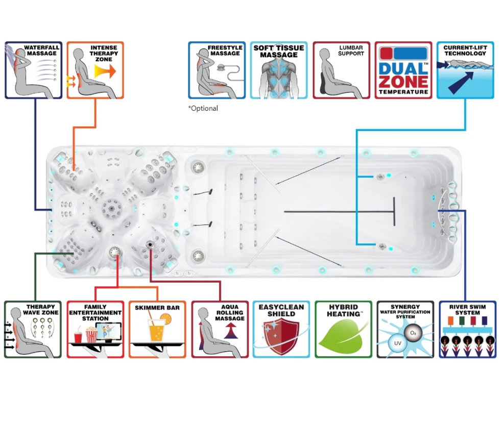 - Система River Swim System — пять мощных форсунок создают равномерный поток воды по всей ширине бассейна, обеспечивая комфортное плавание даже при поднятой голове.